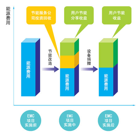 专业化的能源服务公司 (Energy Management Company 简称 EMC) 与愿意进行节能改造的客户签订节能服务合同,按照合同采用先进的节能技术及全新的服务机制来为客户实施节能项目。